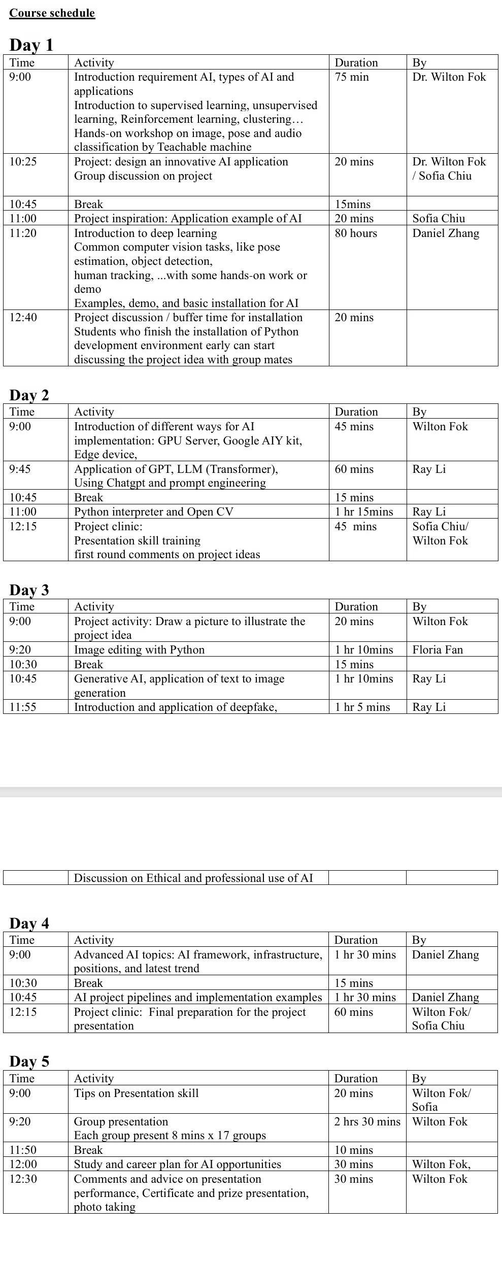 本课程将介绍人工智能的理论、概念及其应用。将介绍深度学习、机器学习和卷积神经网络的知识。学生将学习如何用自己的笔记本电脑搭建开发环境,并掌握基础到中级的Python编程技能。将引入用于模型构建、图像分类、人体姿态分析、异常检测等应用的编程技能。