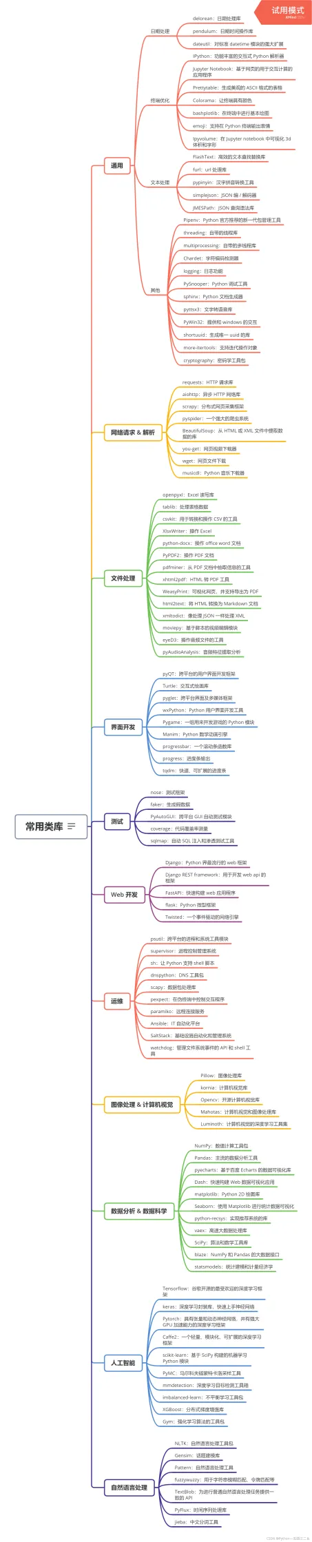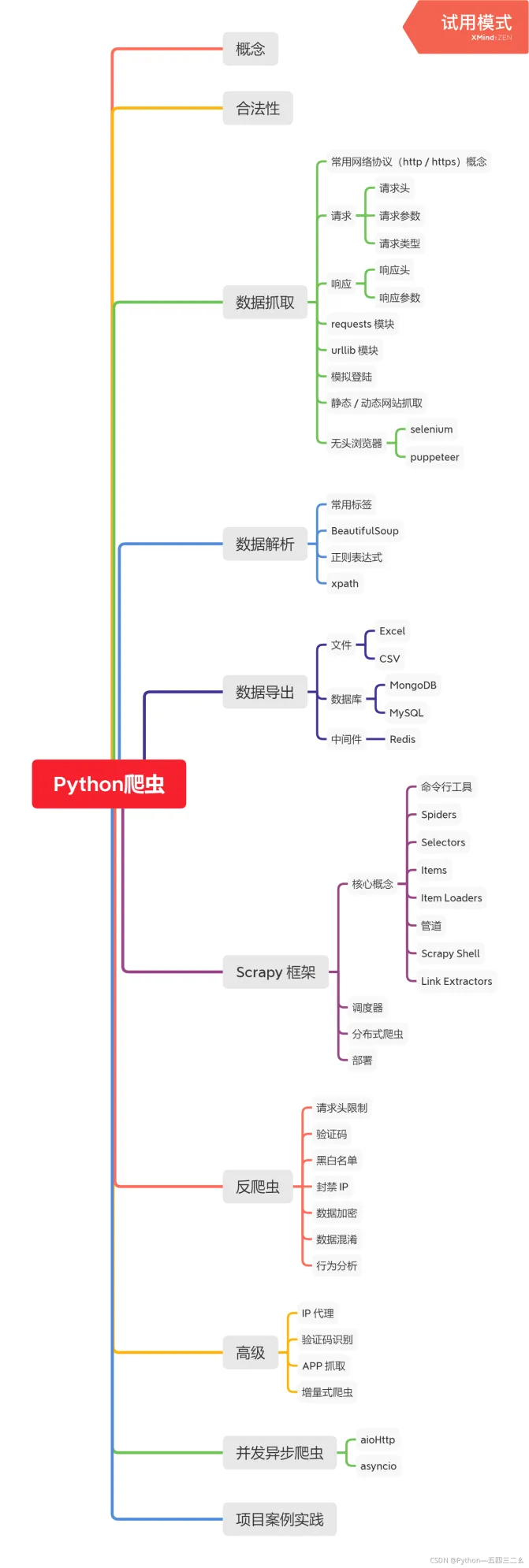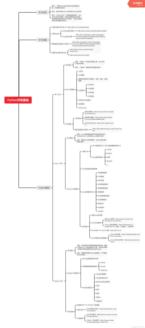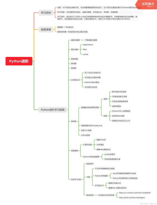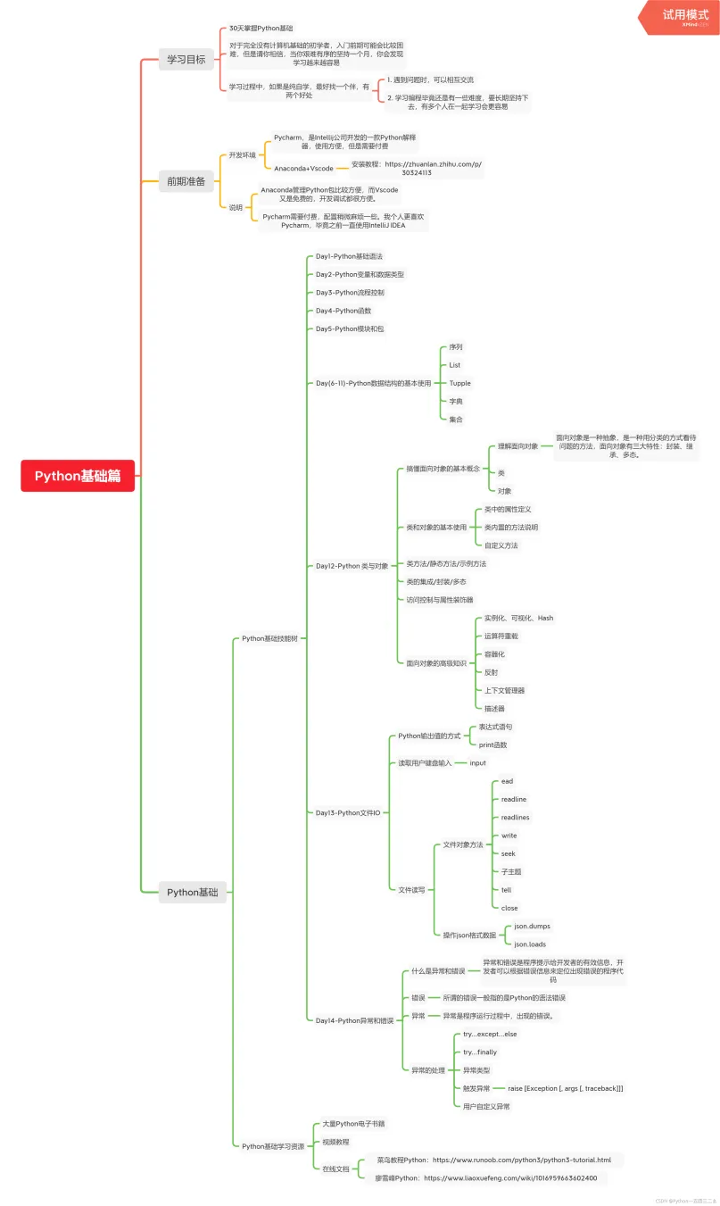 这几张脑图是我花了好几个晚上熬出来帮大家整理的学习路线。大家拿到脑图后,根据脑图对应的学习路线,做好学习计划制定。根据学习计划的路线来逐步学习,正常情况下2个月以内,就能够很好的掌握Python并实现一些实践功能正常情况下,只需要根据我的脑图学习就行,不需要再额外去找其他资料,否则还是会浪费很多时间!
