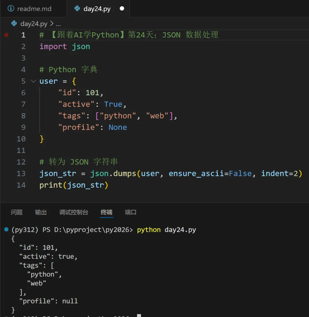 太棒了!欢迎来到 【跟着AI学Python】第24天!🎉今天我们将深入学习 JSON(JavaScript Object Notation) —— 当前最主流的轻量级数据交换格式,广泛用于 Web API、配置文件、数据库存储等场景!