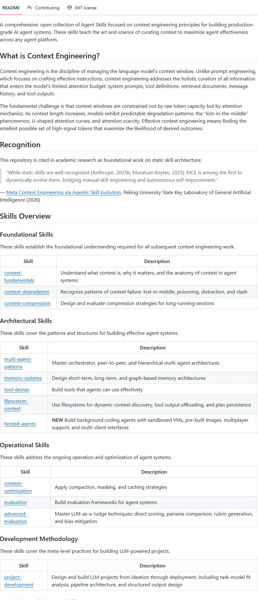 项目提出上下文工程的本质是“高信噪比信息压缩”:在注意力机制约束下,识别并缓解“中间丢失”“上下文污染”“注意力稀释”等典型退化现象。所有技能均围绕“用最少的有效token,激发最可靠的模型行为”这一目标展开设计。