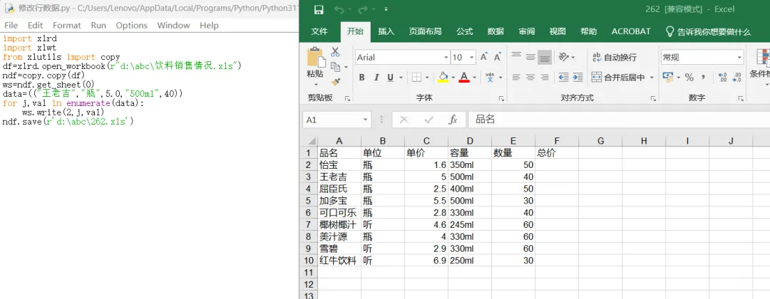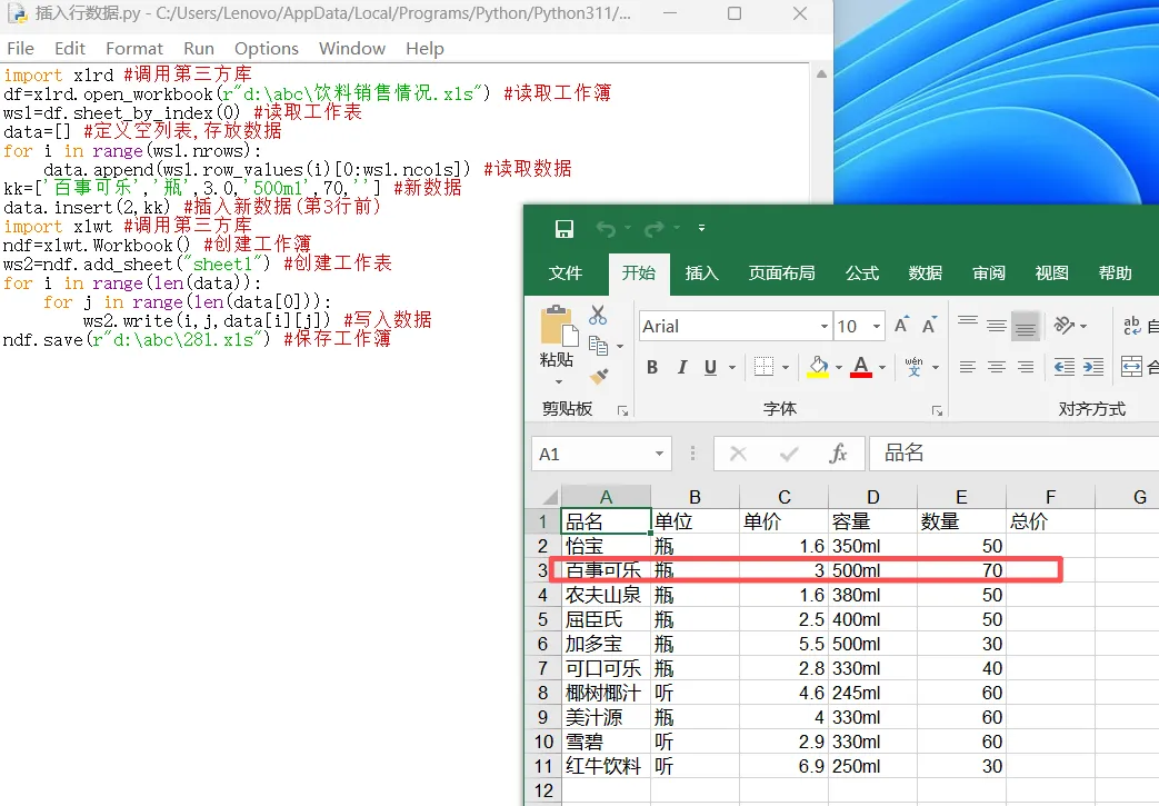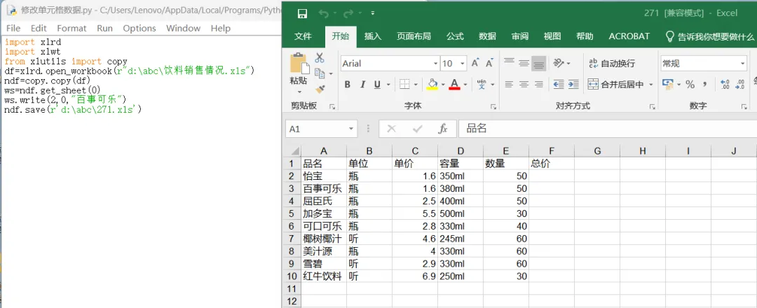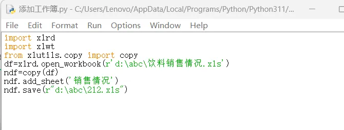 说明:本例中涉及三个外部库,其中,xlrd库用于读取工作簿,xlwt库用于保存工作簿,xlutils库用于复制工作簿。由于xlrd库读入的工作簿不能修改,所以需要先复制成新的工作簿,再进行后面的操作。
