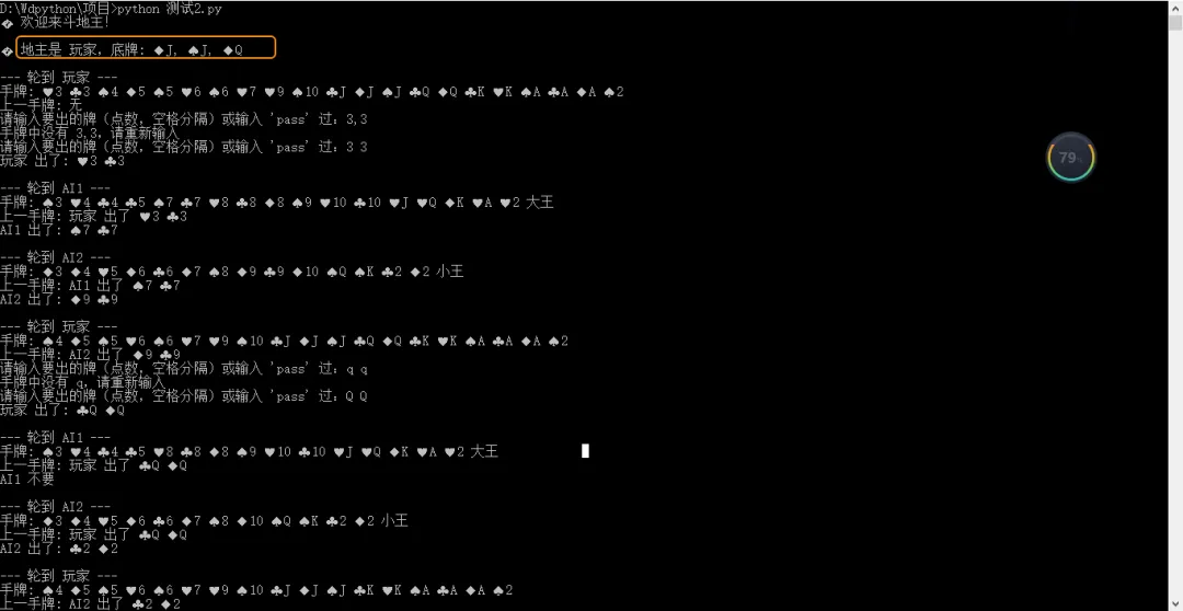 以下是您需要的斗地主游戏Python实现。它包含了完整的牌型判断、出牌规则和简单的AI对手,您可以直接在命令行中运行并开始游戏。以下是您需要的斗地主游戏Python实现。它包含了完整的牌型判断、出牌规则和简单的AI对手,您可以直接在命令行中运行并开始游戏。