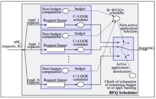 - 为进程分配“预算”(即时间或者扇区数量),控制带宽分配。