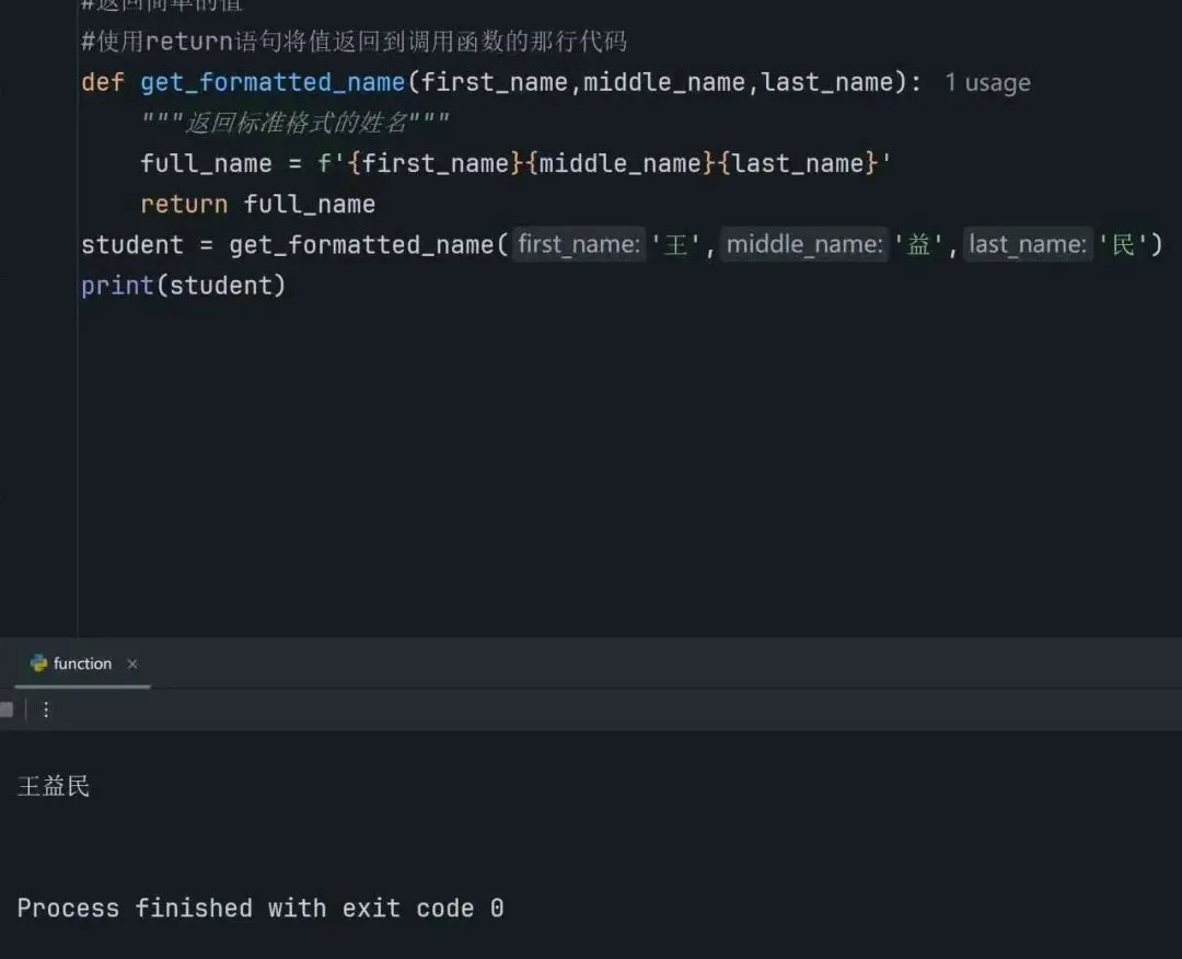 4.通过return语句将结果返回函数调用行(格式化后的全名)