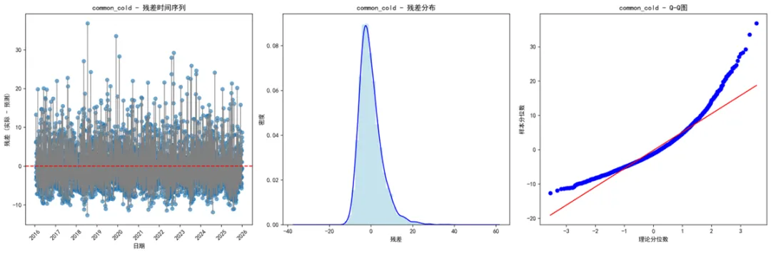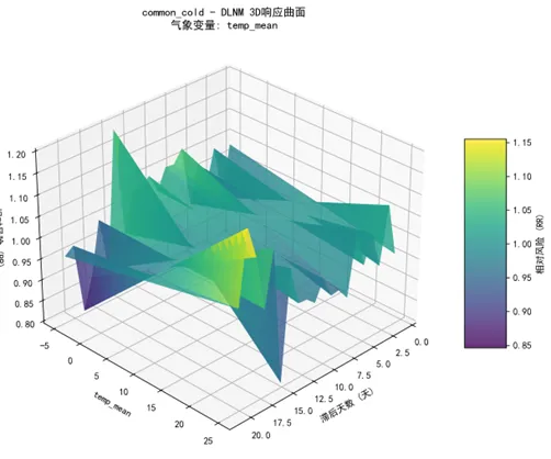 # 4. 残差分析图if self.predictions: residual_count = 0for disease, pred_data in self.predictions.items(): pred_data_clean = pred_data.dropna()if len(pred_data_clean) > 10: pred_data_clean['residuals'] = pred_data_clean['actual'] - pred_data_clean['predicted'] fig, (ax1, ax2, ax3) = plt.subplots(1, 3, figsize=(18, 6))# 残差时间序列 ax1.plot(pred_data_clean['timestamp'], pred_data_clean['residuals'], color='gray', linewidth=1) ax1.scatter(pred_data_clean['timestamp'], pred_data_clean['residuals'], alpha=0.6) ax1.axhline(y=0, color='red', linestyle='--') ax1.set_title(f'{disease} - 残差时间序列') ax1.set_xlabel('日期') ax1.set_ylabel('残差 (实际 - 预测)') ax1.tick_params(axis='x', rotation=45)# 残差分布 ax2.hist(pred_data_clean['residuals'], bins=30, density=True, alpha=0.7, color='lightblue') pred_data_clean['residuals'].plot.density(ax=ax2, color='blue') ax2.set_title(f'{disease} - 残差分布') ax2.set_xlabel('残差') ax2.set_ylabel('密度')# Q-Q图 from scipy import stats stats.probplot(pred_data_clean['residuals'], dist="norm", plot=ax3) ax3.set_title(f'{disease} - Q-Q图') ax3.set_xlabel('理论分位数') ax3.set_ylabel('样本分位数') plt.tight_layout() plot_path = os.path.join(self.results_path, "Plots", f"residual_analysis_{disease}.png") plt.savefig(plot_path, dpi=300, bbox_inches='tight') plt.close() residual_count += 1print(f"生成的残差分析图数量: {residual_count}")# 5. 3D DLNM图和等高线图 self.create_3d_dlnm_plots() self.create_contour_plots() def generate_report(self):"""生成分析报告"""print("生成分析报告...") report_lines = ["DLNM模型训练与预测分析报告","======================================", f"生成时间: {datetime.now()}", f"数据时间范围: {self.combined_data['timestamp'].min()} 至 {self.combined_data['timestamp'].max()}", f"训练集: {self.train_data['timestamp'].min()} 至 {self.train_data['timestamp'].max()} ({len(self.train_data)}天)", f"测试集: {self.test_data['timestamp'].min()} 至 {self.test_data['timestamp'].max()} ({len(self.test_data)}天)","","分析的疾病变量:", ]for disease in self.disease_vars: report_lines.append(f"- {disease}") report_lines.extend(["","分析的气象变量:", ])for meteo in self.meteorological_vars: report_lines.append(f"- {meteo}") best_count = len([k for k in self.dlnm_models.keys() if k.startswith('BEST_')]) pred_count = len(self.predictions) report_lines.extend(["", f"成功拟合的模型数量: {len(self.dlnm_models)}", f"有预测结果的疾病数量: {pred_count}", f"最佳模型数量: {best_count}","" ])if self.performance_metrics: perf_df = pd.DataFrame.from_dict(self.performance_metrics, orient='index') perf_df = perf_df.dropna(subset=['RMSE']).sort_values('RMSE')if len(perf_df) > 0: report_lines.extend(["模型性能排名 (按RMSE升序):", perf_df[['Disease', 'Meteorological_Var', 'RMSE', 'R_squared']].round(4).to_string(index=False) ])else: report_lines.append("没有有效的性能指标数据")else: report_lines.append("没有可用的性能指标数据") report_lines.extend(["","文件输出:", f"- 预测结果: {os.path.join(self.results_path, 'Predictions', 'all_predictions.csv')}", f"- 性能指标: {os.path.join(self.results_path, 'Tables', 'performance_metrics.csv')}", f"- 2D图表文件: {os.path.join(self.results_path, 'Plots')} 目录下的各种图表", f"- 3D图表文件: {os.path.join(self.results_path, 'Plots3D')} 目录下的3D图和等高线图","","分析完成!" ])# 保存报告 report_path = os.path.join(self.results_path, "analysis_report.txt") with open(report_path, 'w', encoding='utf-8') as f: f.write('\n'.join(report_lines))# 完成提示print("\n=== DLNM模型分析完成! ===")print(f"结果保存位置: {self.results_path}")print("包含内容:")print("- 预测结果: Predictions/all_predictions.csv")print("- 性能指标: Tables/performance_metrics.csv")print("- 2D分析图表: Plots/ 目录下的各种图表")print("- 3D DLNM图表: Plots3D/ 目录下的3D图和等高线图")print("- 分析报告: analysis_report.txt")# 显示最佳模型if self.performance_metrics: perf_df = pd.DataFrame.from_dict(self.performance_metrics, orient='index') perf_df = perf_df.dropna(subset=['RMSE']).sort_values('RMSE')if len(perf_df) > 0:print("\n最佳预测性能的疾病模型 (前3名):")print(perf_df[['Disease', 'Meteorological_Var', 'RMSE', 'R_squared']].head(3).round(4))print("\n所有分析已完成!") def run_analysis(self):"""运行完整分析""" try: self.load_and_preprocess_data() self.batch_fit_models() self.make_predictions() self.save_results() self.create_visualizations() self.generate_report() except Exception as e:print(f"分析过程中出现错误: {e}") import traceback traceback.print_exc()# 主执行函数def main():print("开始DLNM分析...")# 运行分析 analyzer = DLNMAnalyzer() analyzer.run_analysis()if __name__ == "__main__": main()