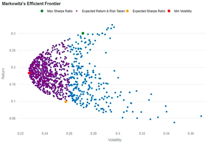 def plot_efficient_frontier(simulated_portfolios, expected_sharpe, expected_return, risk_taken): simulated_portfolios = simulated_portfolios.sort_values(by='Volatility') # concatenating weights so we can hover on them as we select data points simulated_portfolios['Weights'] = simulated_portfolios.iloc[:, 2:-1].apply( lambda row: ', '.join([f'{asset}: {weight:.4f}' for asset, weight in zip(simulated_portfolios.columns[2:-1], row)]), axis=1 ) # creating the plot as a scatter graph frontier = px.scatter(simulated_portfolios, x='Volatility', y='Returns', width=800, height=600, title="Markowitz's Efficient Frontier", labels={'Volatility': 'Volatility', 'Returns': 'Return'}, hover_name='Weights') # getting the index of max Sharpe Ratio and painting in green max_sharpe_ratio_portfolio = simulated_portfolios.loc[simulated_portfolios['Sharpe_ratio'].idxmax()] frontier.add_trace(go.Scatter(x=[max_sharpe_ratio_portfolio['Volatility']], y=[max_sharpe_ratio_portfolio['Returns']], mode='markers', marker=dict(color='green', size=10), name='Max Sharpe Ratio', text=max_sharpe_ratio_portfolio['Weights'])) # Getting portfolios where returns are above our expectations and below # the amount of risk we aim to take low_risk_portfolios = simulated_portfolios[ (simulated_portfolios['Returns'] >= expected_return) & (simulated_portfolios['Volatility'] <= risk_taken) ] frontier.add_trace(go.Scatter(x=low_risk_portfolios['Volatility'], y=low_risk_portfolios['Returns'], mode='markers', marker=dict(color='purple', size=5), name='Expected Return & Risk Taken', text=low_risk_portfolios['Weights'])) # Selecting portfolios with our initial Sharpe ratio expectations # and paiting it orange expected_portfolio = simulated_portfolios[ (simulated_portfolios['Sharpe_ratio'] >= expected_sharpe - 0.001) & (simulated_portfolios['Sharpe_ratio'] <= expected_sharpe + 0.001) ] if not expected_portfolio.empty: frontier.add_trace(go.Scatter(x=[expected_portfolio['Volatility'].values[0]], y=[expected_portfolio['Returns'].values[0]], mode='markers', marker=dict(color='orange', size=10), name='Expected Sharpe Ratio', text=expected_portfolio['Weights'])) # selecting the portfolio with lowest risk and painting it red frontier.add_trace(go.Scatter(x=[simulated_portfolios.iloc[0]['Volatility']], y=[simulated_portfolios.iloc[0]['Returns']], mode='markers', marker=dict(color='red', size=10), name='Min Volatility', text=simulated_portfolios.iloc[0]['Weights'])) frontier.update_layout(legend=dict( orientation='h', yanchor='top', y=1.1, xanchor='center', x=0.5)) st.plotly_chart(frontier)
