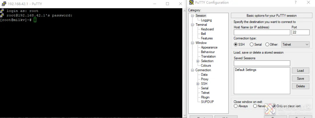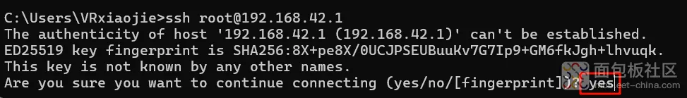 SSH接入通过下载并使用Putty连接板子和电脑;首次连接会有如下提示,直接输入 yes。密码是 milkv 这个不回显,敲完回车即可。