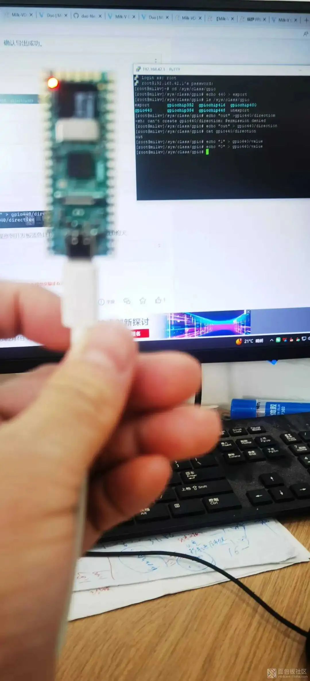 cat gpio440/direct运行命令,将GPIO440的值设为1,即高电平,输入代码echo "1" > gpio440/v;观察到开发板蓝色LED常亮;反之设为0,则LED熄灭