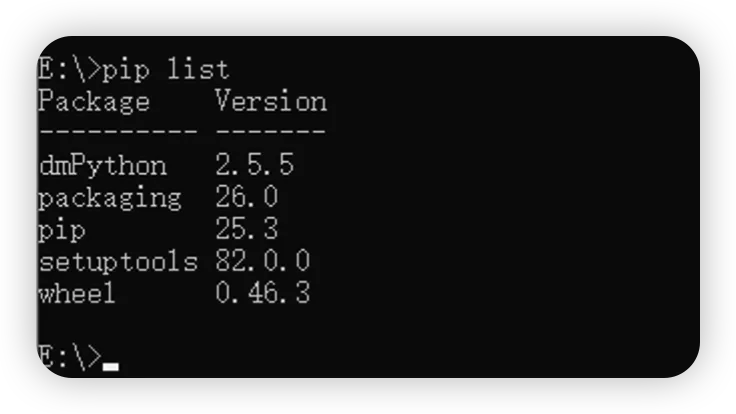 如果在输出的扩展包列表中能看到 dmPython 以及对应的版本号,就说明您的 Windows 环境下的 dmPython编译安装已经大功告成了!接下来就可以在代码中使用 import dmPython 来连接达梦数据库了。