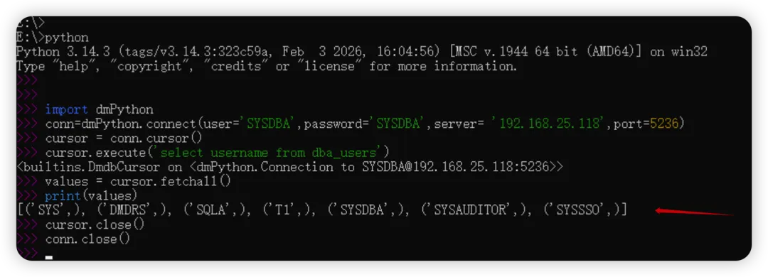 import dmPythonconn=dmPython.connect(user='SYSDBA',password='SYSDBA',server= '192.168.25.118',port=5236)cursor = conn.cursor()cursor.execute('select username from dba_users')values = cursor.fetchall()print(values)cursor.close()conn.close()