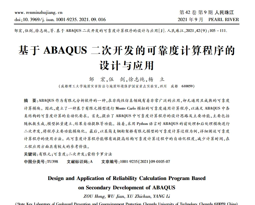 参考资料:邹宏, 伍剑, 徐志纯, 等. 基于ABAQUS二次开发的可靠度计算程序的设计与应用[J]. 人民珠江, 2021, 42(9): 105-111.