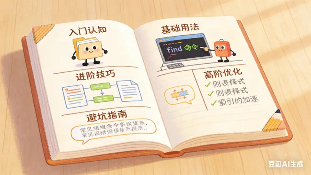 - • 入门:记住基本格式,会用find . 打印当前目录所有文件,完成“从0到1”的突破。
