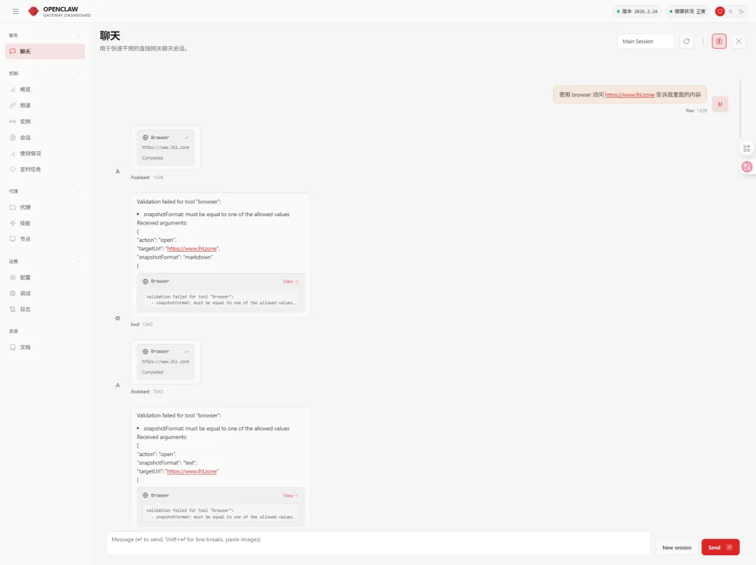 看到有以上结果命令结果则成功了,接下来我们使用界面测试在浏览器中输入http://ip:18789 聊天窗口里执行