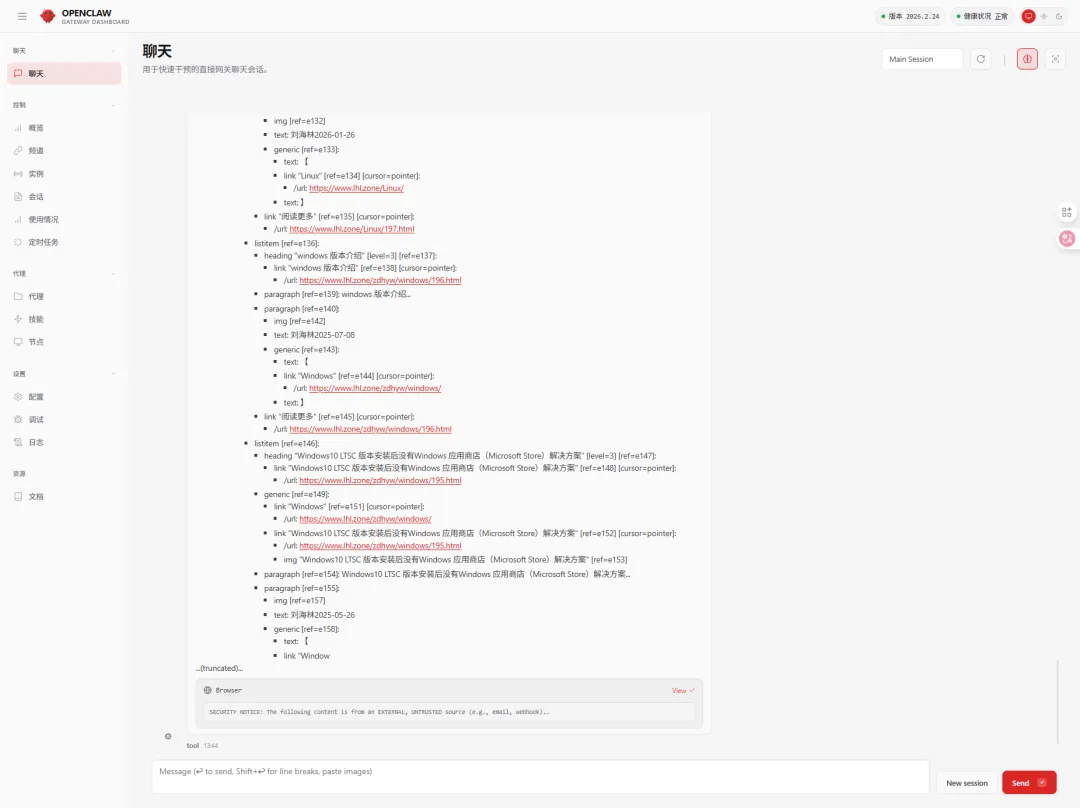 # 打开 https://www.lhl.zone 这个网站root@ub25:~# openclaw browser open https://www.lhl.zone🦞 OpenClaw 2026.2.24 (df9a474) — Your .env is showing; don't worry, I'll pretend I didn't see it.|o opened: https://www.lhl.zone/id: C1A1A75FFD0258EDBBD198B79E0E4B65# 获取网页中的内容root@ub25:~# openclaw browser snapshot🦞 OpenClaw 2026.2.24 (df9a474) — If something's on fire, I can't extinguish it—but I can write a beautiful postmortem.|o - generic [active] [ref=e1]: - banner [ref=e2]: - generic [ref=e3]: - heading [level=2] [ref=e4] - heading "刘海林-运维经验10年+" [level=1] [ref=e6]: - link "刘海林-运维经验10年+" [ref=e7] [cursor=pointer]: - /url: https://www.lhl.zone - navigation - article [ref=e10]: - generic [ref=e11]: - generic [ref=e14]: - listitem [ref=e15]: - link "IT运维托管" [ref=e16] [cursor=pointer]: - /url: http://www.lhl.zone/it_operation/118.html - img "IT运维托管" [ref=e17] - list [ref=e20]: - listitem [ref=e21] [cursor=pointer]: "0" - list [ref=e23]: - listitem [ref=e24]: - link "ubuntu 开启root用户登录桌面 ubuntu 开启root用户登录桌面" [ref=e25] [cursor=pointer]: - /url: https://www.lhl.zone/Linux/197.html - img "ubuntu 开启root用户登录桌面" [ref=e26] - generic [ref=e27]: ubuntu 开启root用户登录桌面 - listitem [ref=e28]: - link "Windows系统安装composer教程 Windows系统安装composer教程" [ref=e29] [cursor=pointer]: - /url: https://www.lhl.zone/WebServer/PHP/146.html - img "Windows系统安装composer教程" [ref=e30] - generic [ref=e31]: Windows系统安装composer教程 - generic [ref=e32]: - generic [ref=e33]: - list: - listitem [ref=e34] [cursor=pointer]: IT运维托管 - listitem [ref=e35] [cursor=pointer]: Linux[centos] - listitem [ref=e36] [cursor=pointer]: OpenStack - listitem [ref=e37] [cursor=pointer]: Kubernetes - listitem [ref=e38] [cursor=pointer]: 数据库 - listitem [ref=e39] [cursor=pointer]: WebServer - listitem [ref=e40] [cursor=pointer]: Windows - listitem [ref=e41] [cursor=pointer]: Docker - generic: - generic: - list [ref=e43]: - listitem [ref=e44]: - link "运维托管的收费模式及费用有哪些? 运维托管的收费模式及费用有哪些?" [ref=e45] [cursor=pointer]: - /url: https://www.lhl.zone/it_operation/132.html - img "运维托管的收费模式及费用有哪些?" [ref=e46] - generic [ref=e47]: 运维托管的收费模式及费用有哪些? - listitem [ref=e48]: - link "什么是IT运维托管服务? 什么是IT运维托管服务?" [ref=e49] [cursor=pointer]: - /url: https://www.lhl.zone/it_operation/125.html - img "什么是IT运维托管服务?" [ref=e50] - generic [ref=e51]: 什么是IT运维托管服务? - list [ref=e52]: - listitem [ref=e53]: - generic [ref=e54]: "1" - link "IT运维与工作内容" [ref=e55] [cursor=pointer]: - /url: https://www.lhl.zone/it_operation/187.html - paragraph [ref=e56]: IT运维服务是一项关键的技术服务,它主要涉及对企业信息系统内各种硬件、软件和网络设备的日常维护、监控和管理。其目标是确保企业信息系统的稳定性、安全性和高效性,以满足企业的业务需求。 - listitem [ref=e57]: - generic [ref=e58]: "2" - link "运维托管的收费模式及费用有哪些?" [ref=e59] [cursor=pointer]: - /url: https://www.lhl.zone/it_operation/132.html - paragraph [ref=e60]: 运维托管的收费模式有哪些?我们的收费模式大致分为一下2方式,按次计费用,包月收费模式 - listitem [ref=e61]: - generic [ref=e62]: "3" - link "IT运维在企业中的价值有那些?" [ref=e63] [cursor=pointer]: - /url: https://www.lhl.zone/it_operation/128.html - paragraph [ref=e64]: 随着大数据、人工智能、云计算等新技术的发展,IT运维工程师所面临的企业IT系统越发的复杂,各个业务互相影响互相关联逐渐加深。对IT运维工程师的要求也会越来越高,对企业IT系统了如指 - listitem [ref=e65]: - generic [ref=e66]: "4" - link "网站运维托管主要工作内容有那些?" [ref=e67] [cursor=pointer]: - /url: https://www.lhl.zone/it_operation/126.html - paragraph [ref=e68]: 目前很多企业建立了网站,但是却没有运营起来,随着时间的推移,网站已经变成了僵尸网站,没有达到一个网站该有的作用,这时候就要找一个专业网站托管公司了。在这里,我们一起看看网站运维托管 - listitem [ref=e69]: - generic [ref=e70]: "5" - link "什么是IT运维托管服务?" [ref=e71] [cursor=pointer]: - /url: https://www.lhl.zone/it_operation/125.html - paragraph [ref=e72]: 什么是IT运维托管服务?IT运维托管服务”通常是将你公司的运维托管给外包IT运维服务提供商,由IT运维服务提供商(MSP)管理你的IT运维解决方案,通常包括企业网络(路由器、交换机 - text: 1 2 3 4 5 1 2 3 4 5 1 2 3 4 5 1 2 3 4 5 1 2 3 4 5 1 2 3 4 5 1 2 3 4 5 - generic [ref=e73]: - heading "虚拟化与云计算入门到精通教程 虚拟化与云计算专题" [level=2] [ref=e74]: - link "虚拟化与云计算入门到精通教程" [ref=e76] [cursor=pointer]: - /url: https://www.lhl.zone/virtualization/ - text: 虚拟化与云计算专题 - list [ref=e77]: - listitem [ref=e78]: - link "KVM虚拟机" [ref=e80] [cursor=pointer]: - /url: https://www.lhl.zone/virtualization/kvm/ - img "KVM虚拟机" [ref=e81] - generic [ref=e82]: KVM虚拟机 - generic [ref=e83]: KVM是Kernel-based Virtual Machine的简称,是一个开源的系统虚拟化模块,自Linux 2.6.20之后集成在Linux的各个主要发行版本中。KVM的虚拟化需要硬件支持(如Intel VT技术或者AMD V技术)。是基于硬件的完全虚拟化。它使用Linux自身的调度器进行管理,所以相对于Xen,其核心源码很少。... - link "+文章阅读" [ref=e84] [cursor=pointer]: - /url: https://www.lhl.zone/virtualization/kvm/ - listitem [ref=e85]: - link "Hyper-V虚拟机" [ref=e87] [cursor=pointer]: - /url: https://www.lhl.zone/virtualization/Hyper-V/ - img "Hyper-V虚