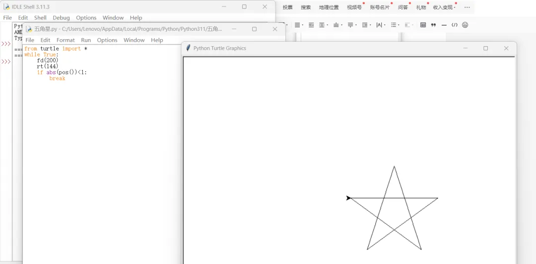 (2) rt(144)语句中的数字为弧度。更改程序中弧度的度数,可以画出六角星等。