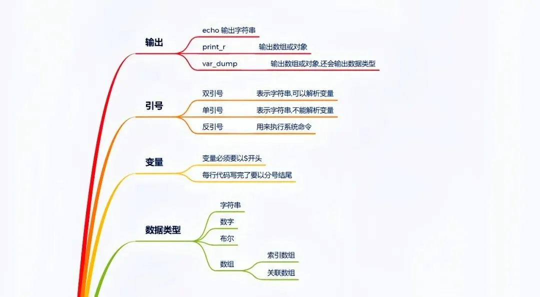 $age=18; // 数字$name="小明"; // 字符串 $isStudent=true; // 布尔值(真/假)// 数组有两种:$colors=["红","黄","蓝"]; // 索引数组,像排队$student=["name"=>"小明","age"=>18]; // 关联数组,像填表
