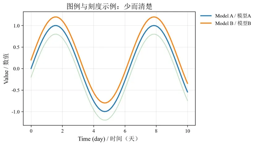 import osimport numpy as npimport matplotlib as mplimport matplotlib.pyplot as pltfrom matplotlib import font_manager as fmfrom matplotlib.ticker import MaxNLocator, FormatStrFormatter# == 字体:英文 ==fm.fontManager.addfont(r"C:\Windows\Fonts\times.ttf")fm.fontManager.addfont(r"C:\Windows\Fonts\simsun.ttc")mpl.rcParams["font.family"] = ["Times New Roman", "SimSun"]mpl.rcParams["axes.unicode_minus"] = FalseOUT_DIR = r"D:\py_figs"os.makedirs(OUT_DIR, exist_ok=True)# == 数据 ==x = np.linspace(0, 10, 80)y1 = np.sin(x)y2 = np.sin(x) + 0.2y3 = np.sin(x) - 0.2# 假装是“辅助曲线” fig, ax = plt.subplots(figsize=(6, 4))# 主线:进入图例ax.plot(x, y1, linewidth=2, label="Model A / 模型A")ax.plot(x, y2, linewidth=2, label="Model B / 模型B")# 辅助线:不进图例ax.plot(x, y3, linewidth=1.2, alpha=0.35, label="_nolegend_")ax.set_title("图例与刻度示例:少而清楚", fontsize=14)ax.set_xlabel("Time (day) / 时间(天)", fontsize=12)ax.set_ylabel("Value / 数值", fontsize=12)# == 刻度:控制数量 + 统一格式 ==ax.xaxis.set_major_locator(MaxNLocator(nbins=6))# 目标 4-7 个刻度ax.yaxis.set_major_locator(MaxNLocator(nbins=6))ax.yaxis.set_major_formatter(FormatStrFormatter("%.1f"))# 统一 1 位小数 ax.grid(alpha=0.25)# ===== 图例:放图外(不遮挡曲线)=====ax.legend( loc="upperleft", bbox_to_anchor=(1.02, 1.0),# 图外右侧 borderaxespad=0.0, frameon=False)fig.savefig(os.path.join(OUT_DIR, "legend_ticks_clean.jpg"), dpi=300, bbox_inches="tight")plt.close(fig)