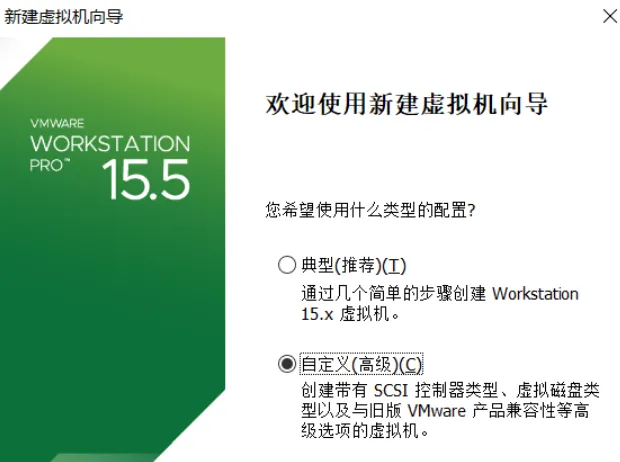 1. 双击打开VMware,点击左上角“创建新的虚拟机”,弹出界面后,选择“自定义(高级)”,点击“下一步”;