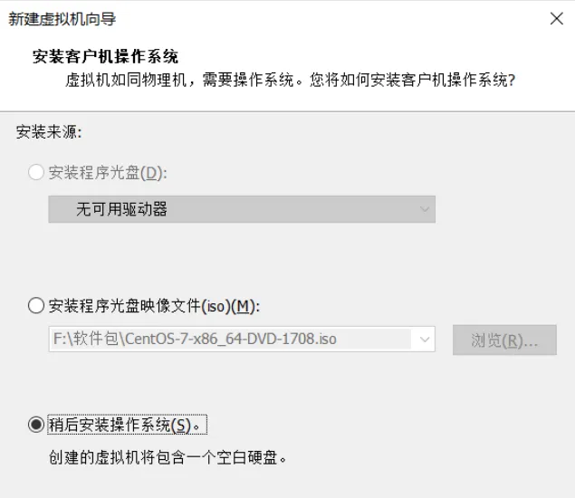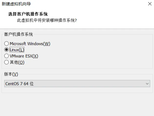 2. 选择“稍后安装操作系统”,点击“下一步”;选择客户机操作系统“Linux”,点击“下一步;