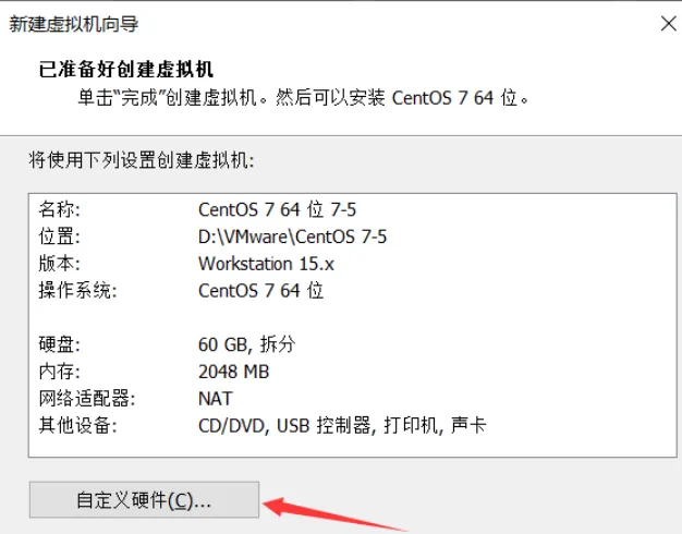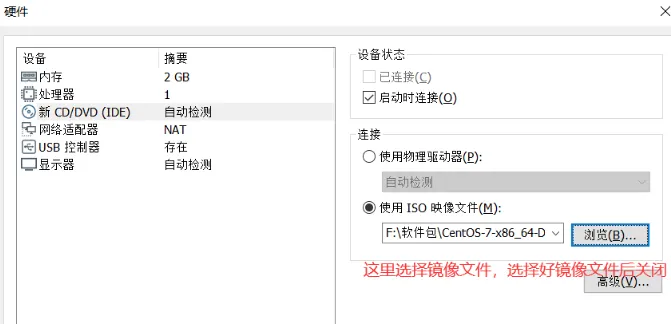 7. 点击”自定义硬件“选择”镜像文件“选好文件后关闭;点击“完成”,虚拟机开始创建,创建完成后,点击“开启此虚拟机”,进入Linux安装界面;