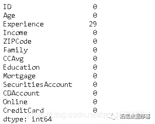 52#清理负数变量dfExp = data.loc\[data\['Experience'\] >0\]data.loc\[negExp\]\['ID'\].tolist() # 得到有负数经验的客户ID