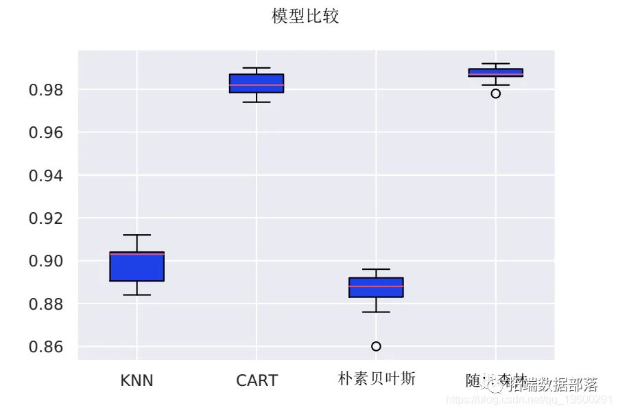 for name, model in models: kfold = model\_selection.KFold(n\_splits=10) cv\_results = model\_selection.cross\_val\_score(model, X, y, cv, scoring)# 箱线图算法的比较plt.figure()