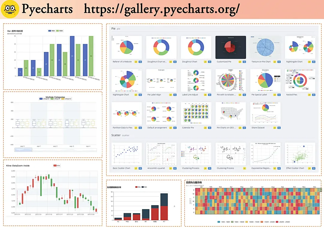📍关键词:国人开发、超适合国内项目、图表酷炫Pyecharts 是基于百度开源的 Echarts 图表库封装的 Python 工具,国内做项目、报表时非常适用!它支持中文特别友好,而且图表种类超级多,比如: