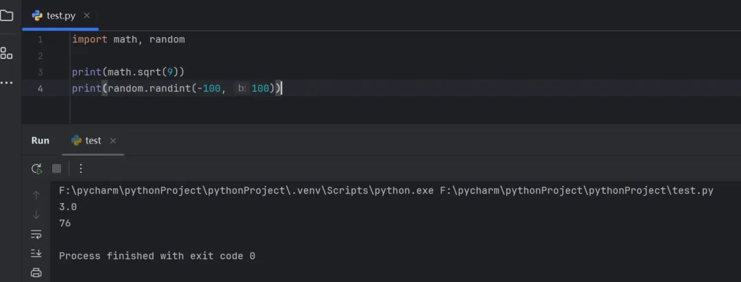 import math, randomprint(math.sqrt(9))print(random.randint(-100, 100))