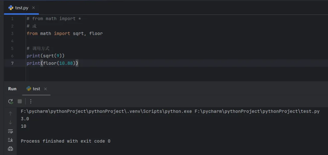 # from math import *# 或from math importsqrt, floor# 调用方式print(sqrt(9))print(floor(10.88))