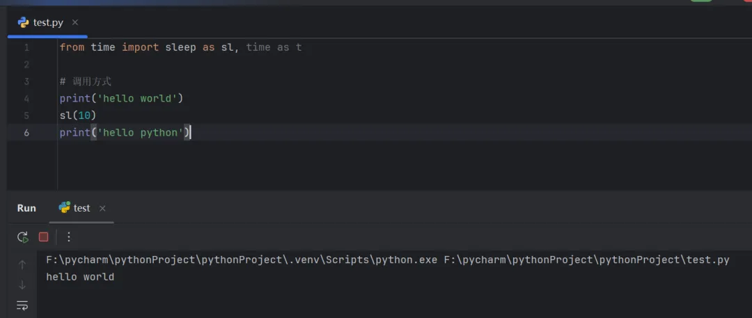 from time import sleep as sl, time as t# 调用方式print('hello world')sl(10)print('hello python')