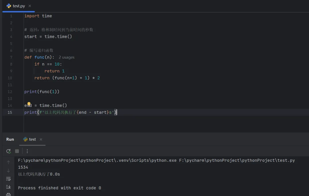 import time# 返回:格林制时间到当前时间的秒数start = time.time()# 编写递归函数def func(n): if n == 10: return1 return (func(n+1) + 1) * 2print(func(1))end = time.time()print(f'以上代码共执行了{end - start}s')