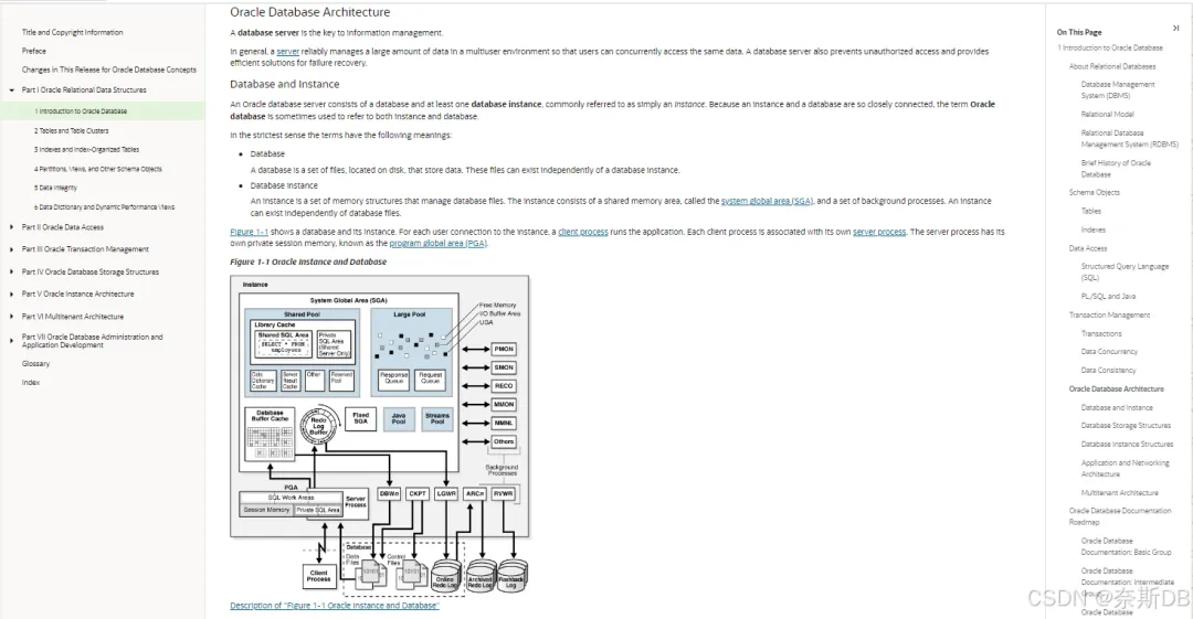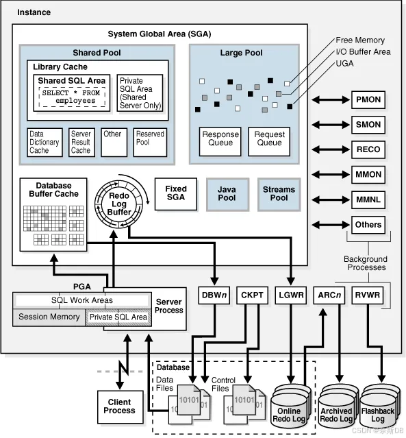如下图是Linux上的Oracle数据库体系结构,这里博主就直接上官方文档上的截图了,反而比博主直接手绘更直观。