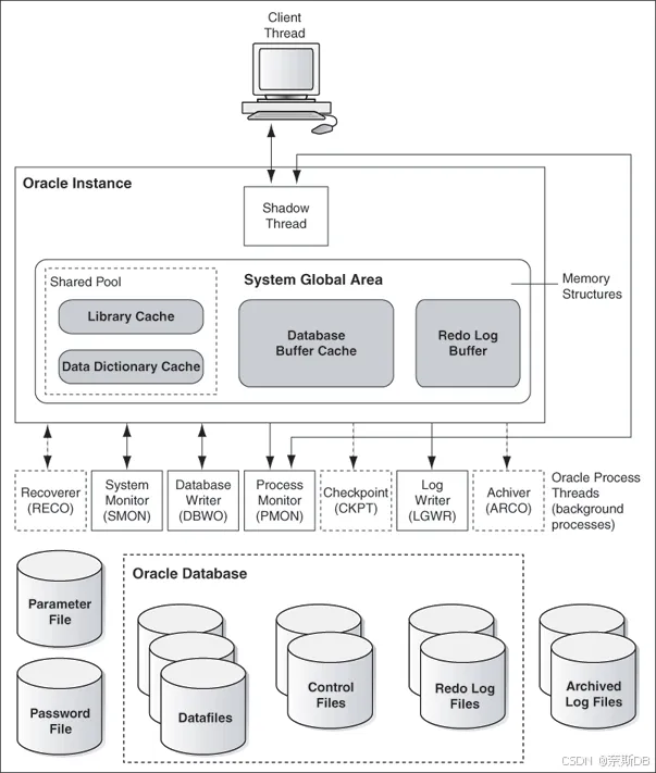 客户端通过一个线程连接到Oracle实例,线程直接与进程监控器连接。内存结构包括共享池、库缓存、数据字典缓存、数据库缓冲缓存和重做日志缓冲区。