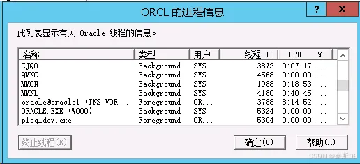 可以看到当前orcl实例下的所有用户进程、服务器进程、后台进程(如PMON、SMON、DBWn等),这样就可以按照SQL查出的线程ID对对应的线程在系统层面进行终止操作啦!