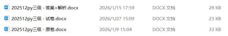 本次Python三级等级考试满分100分,共38题,涵盖单选题25题(50分)、判断题10题(20分)、编程题3题(30分),核心考查数制转换、列表操作、文件处理、异常处理、算法基础等Python重点知识点,内容适配备考复习与知识点梳理,以下为完整版真题+详细解析。
