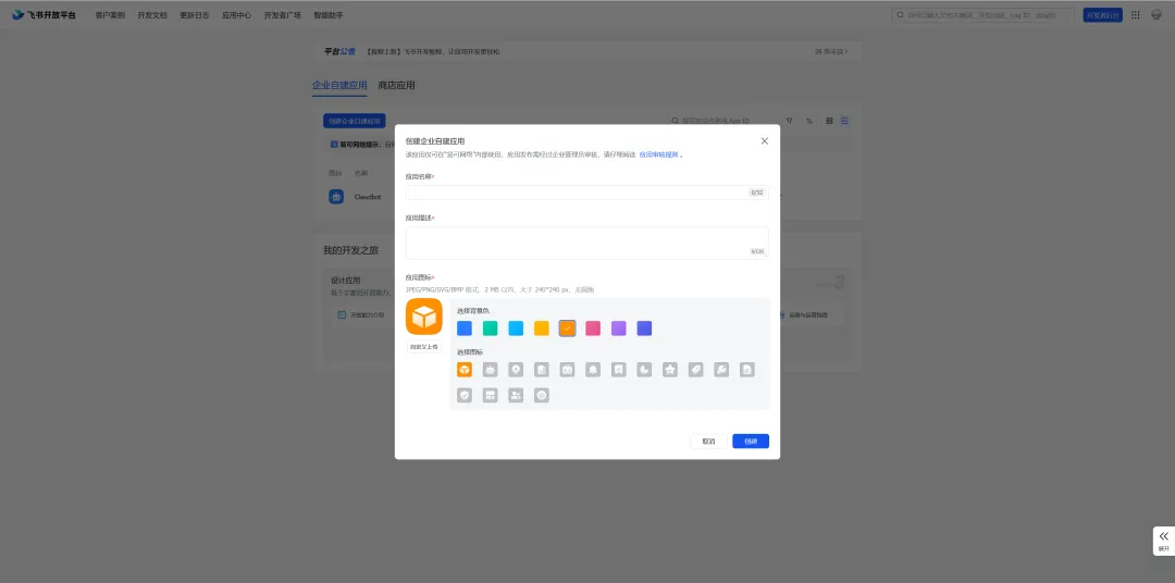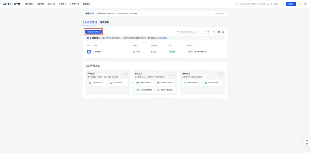 1、前往飞书后台,点击【创建企业自建应用】