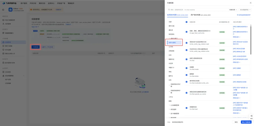 4、在【权限管理】Tab中选择开通【消息与群组】中所有免审的权限