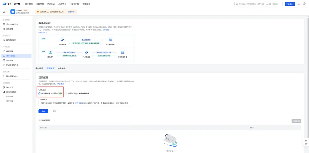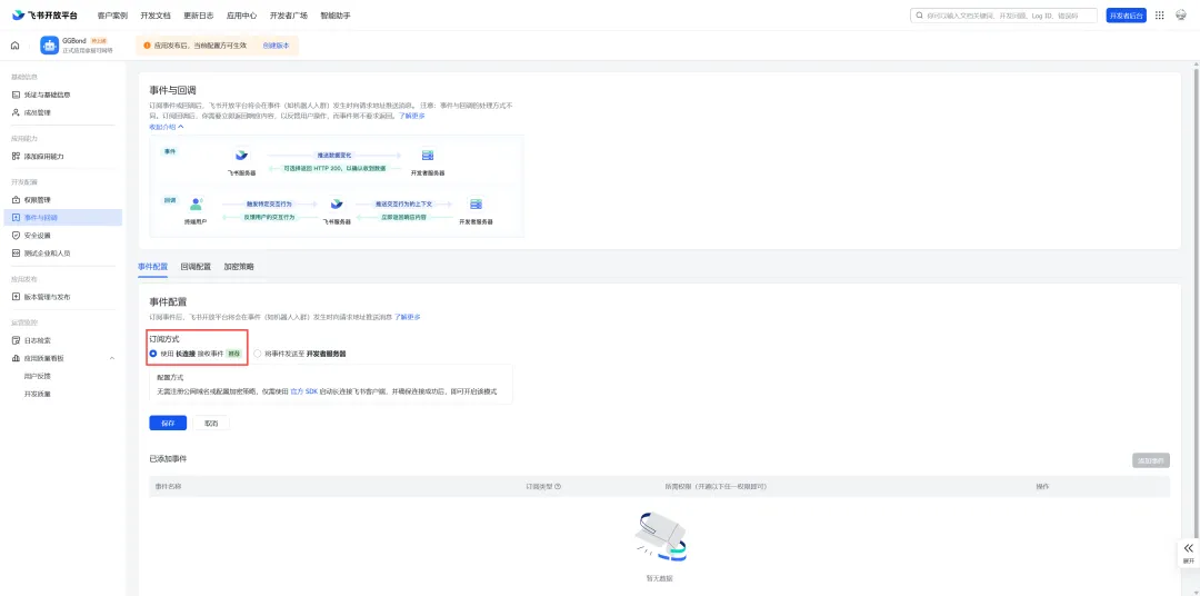 6、在【事件与回调】Tab中的事件配置和回调配置中修改订阅方式为长连接并保存
