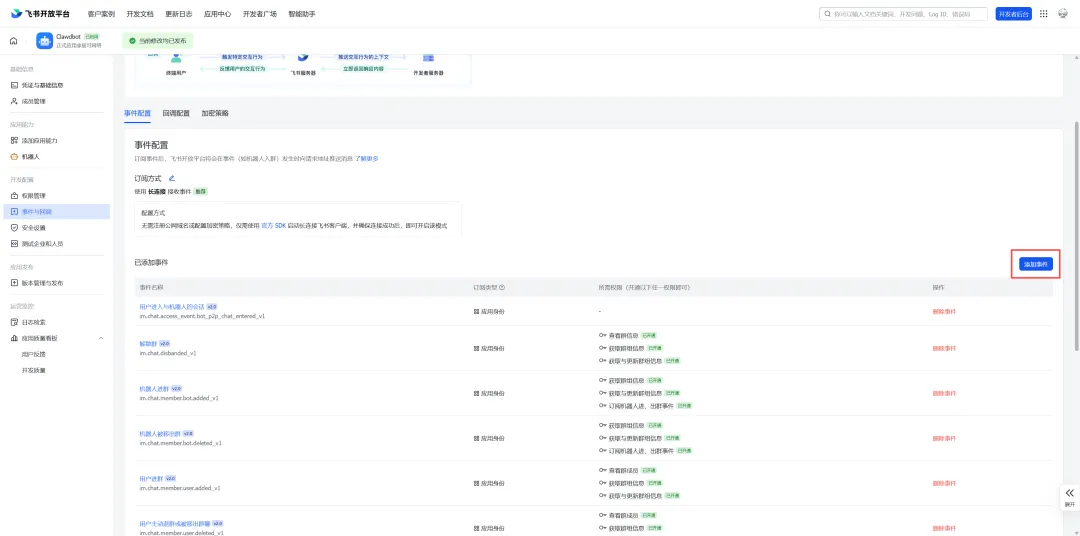 7、在【事件与回调】Tab中添加事件,添加【消息与群组】中的所有权限