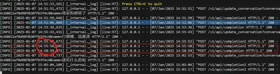 tests\test_appapi.py json:{'code': 0, 'data': {'id': 'eab0232fccc611ef9b09f020ff63f4c4', 'dialog_id': '34bb8d02b30911ef9c3b0242ac120006', 'open_id': 'qhz1234567890', 'token': '', 'is_intent': None, 'intention': None, 'dispatch': None, 'name': '测试速度', 'message': [{'content': '你好! 我是专业宠物医生,有什么可以帮到你的吗?', 'role': 'assistant'}], 'reference': [], 'create_time': 1736234062221, 'create_date': '2025-01-07T15:14:22', 'update_time': 1736234062221, 'update_date': '2025-01-07T15:14:22'}, 'msg': 'success'}现在不本地不稳定,去线上试试。