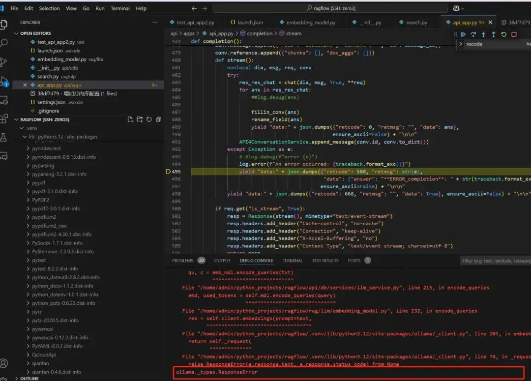 'Traceback (most recent call last): 1File "/home/admin/python_projects/ragflow/api/apps/api_app.py", line 484, in stream for ans in res_res_chat: 2 File "/home/admin/python_projects/ragflow/api/db/services/dialog_service.py", line 406, in chat kbinfos = retr.retrieval(" ".join(questions), embd_mdl, dialog.tenant_id, dialog.kb_ids, 1, dialog.top_n, ^^^^^^^^^^^^^^^^^^^^^^^^^^^^^^^^^^^^^^^^^^^^^^^^^^^^^^^^^^^^^^^^^^^^^^^^^^^^^^^^^^^^^^^^^^^^^^^ 3File "/home/admin/python_projects/ragflow/rag/nlp/search.py", line 407, in retrieval sres = self.search(req, index_name(tenant_id), embd_mdl, highlight) ^^^^^^^^^^^^^^^^^^^^^^^^^^^^^^^^^^^^^^^^^^^^^^^^^^^^^^^^^^^^ 4File "/home/admin/python_projects/ragflow/graphrag/search.py", line 78, in search s["knn"] = self._vector( ^^^^^^^^^^^^^ 5File "/home/admin/python_projects/ragflow/rag/nlp/search.py", line 68, in _vector qv, c = emb_mdl.encode_queries(txt) ^^^^^^^^^^^^^^^^^^^^^^^^^^^ 6File "/home/admin/python_projects/ragflow/api/db/services/llm_service.py", line 215, in encode_queries emd, used_tokens = self.mdl.encode_queries(query) ^^^^^^^^^^^^^^^^^^^^^^^^^^^^^^ 7File "/home/admin/python_projects/ragflow/rag/llm/embedding_model.py", line 232, in encode_queries res = self.client.embeddings(prompt=text, ^^^^^^^^^^^^^^^^^^^^^^^^^^^^^^^^^^^ 8File "/home/admin/python_projects/ragflow/.venv/lib/python3.12/site-packages/ollama/_client.py", line 201, in embeddings return self._request( ^^^^^^^^^^^^^^ 9File "/home/admin/python_projects/ragflow/.venv/lib/python3.12/site-packages/ollama/_client.py", line 74, in _request raise ResponseError(e.response.text, e.response.status_code) from Noneollama._types.ResponseError'注:一个一个打断点。