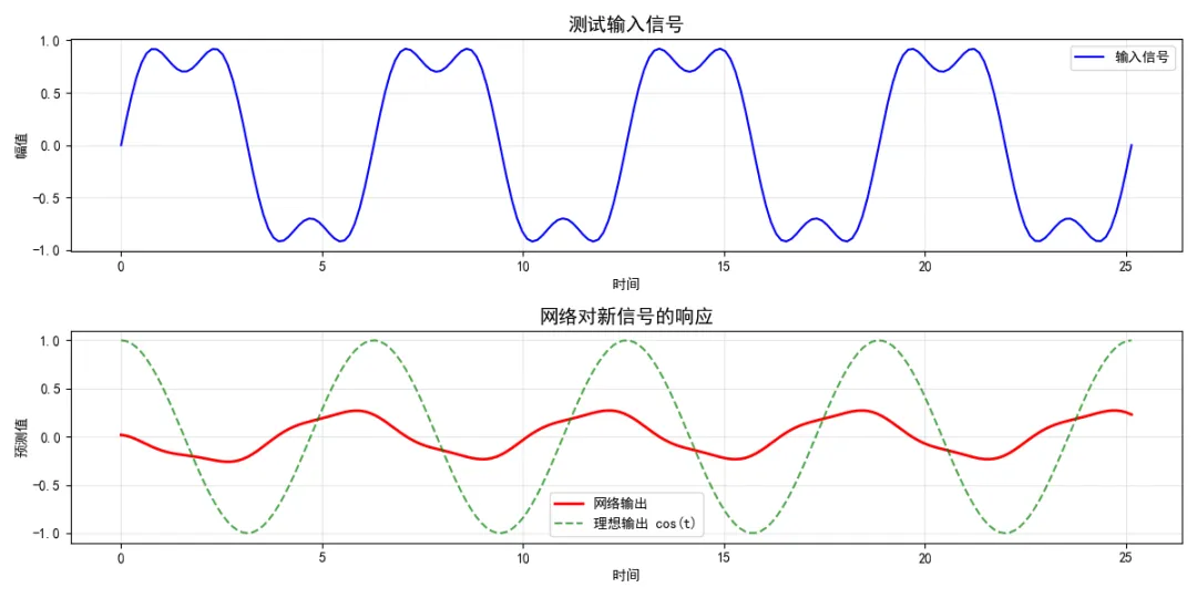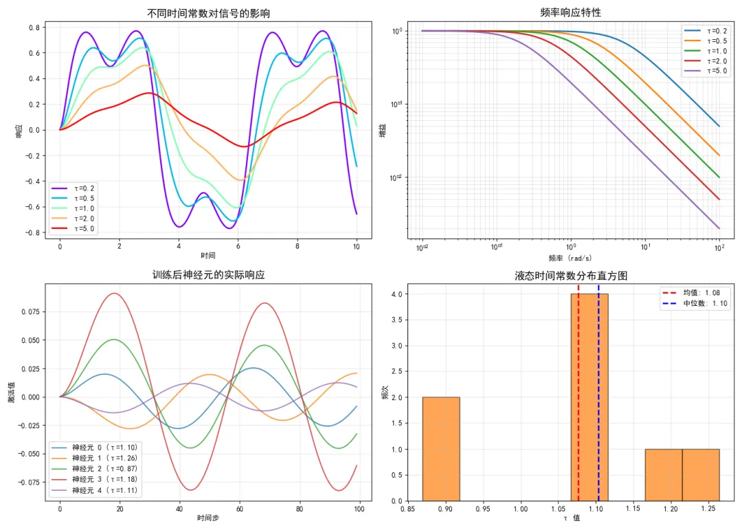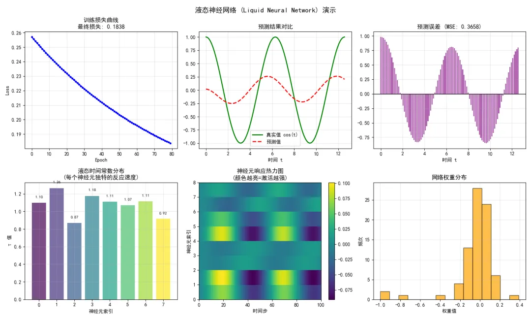 import numpy as npimport matplotlib.pyplot as pltimport timeplt.rcParams['font.sans-serif'] = ['SimHei', 'Microsoft YaHei', 'DejaVu Sans']plt.rcParams['axes.unicode_minus'] = False# 设置随机种子np.random.seed(42)# ======================# 1. 数据准备# ======================def generate_data(): """生成训练数据:从sin(t)预测cos(t)""" t = np.linspace(0, 4 * np.pi, 100) X = np.sin(t).reshape(-1, 1) Y = np.cos(t).reshape(-1, 1) return t, X, Yt, X, Y = generate_data()print(f"数据形状 - X: {X.shape}, Y: {Y.shape}")# ======================# 2. 液态神经元层# ======================class LiquidLayer: """液态神经元层""" def __init__(self, input_size, hidden_size, dt=0.1): self.input_size = input_size self.hidden_size = hidden_size self.dt = dt # 初始化参数 self.W_in = np.random.randn(hidden_size, input_size) * 0.1 self.W_h = np.random.randn(hidden_size, hidden_size) * 0.1 self.bias = np.zeros(hidden_size) self.log_tau = np.random.randn(hidden_size) * 0.1 @property def tau(self): return np.exp(self.log_tau) + 0.1 def forward(self, x, return_all=False): """ 前向传播 x: 输入序列 [seq_len, input_size] """ seq_len = x.shape[0] h = np.zeros(self.hidden_size) h_seq = [] for t in range(seq_len): x_t = x[t] # 液态神经元动力学 pre_act = np.dot(self.W_in, x_t) + np.dot(self.W_h, h) + self.bias dh = (-h + np.tanh(pre_act)) / self.tau h = h + self.dt * dh h_seq.append(h.copy()) h_seq = np.array(h_seq) if return_all: return h_seq else: return h_seq[-1] # 只返回最后一个时间步# ======================# 3. 液态神经网络# ======================class LiquidNeuralNetwork: """液态神经网络""" def __init__(self, input_size=1, hidden_size=10, output_size=1, lr=0.01): self.hidden_size = hidden_size self.lr = lr # 液态层 self.liquid = LiquidLayer(input_size, hidden_size) # 输出层 self.W_out = np.random.randn(output_size, hidden_size) * 0.1 self.b_out = np.zeros(output_size) self.loss_history = [] def forward(self, x): """前向传播 - 返回最后一个时间步的预测""" h_last = self.liquid.forward(x, return_all=False) y_pred = np.dot(self.W_out, h_last) + self.b_out return y_pred, h_last def forward_all(self, x): """前向传播 - 返回所有时间步的隐藏状态""" h_seq = self.liquid.forward(x, return_all=True) return h_seq def compute_loss(self, y_pred, y_true): """计算损失""" return 0.5 * np.mean((y_pred - y_true) ** 2) def train_step(self, x, y_true): """单步训练""" # 保存当前参数 W_out_old = self.W_out.copy() b_out_old = self.b_out.copy() log_tau_old = self.liquid.log_tau.copy() # 前向传播 y_pred, h_last = self.forward(x) loss = self.compute_loss(y_pred, y_true) # 计算输出层梯度(解析梯度) error = y_pred - y_true # [output_size] grad_W_out = np.outer(error, h_last) # [output_size, hidden_size] grad_b_out = error # [output_size] # 更新输出层 self.W_out -= self.lr * grad_W_out self.b_out -= self.lr * grad_b_out # 计算液态层梯度(数值梯度) eps = 1e-4 # 对每个液态时间常数计算梯度 for i in range(self.hidden_size): # 保存原始值 original_tau = self.liquid.log_tau[i] # 正向扰动 self.liquid.log_tau[i] = original_tau + eps y_pred_plus, _ = self.forward(x) loss_plus = self.compute_loss(y_pred_plus, y_true) # 负向扰动 self.liquid.log_tau[i] = original_tau - eps y_pred_minus, _ = self.forward(x) loss_minus = self.compute_loss(y_pred_minus, y_true) # 恢复原始值 self.liquid.log_tau[i] = original_tau # 计算梯度并更新 grad_tau = (loss_plus - loss_minus) / (2 * eps) self.liquid.log_tau[i] -= self.lr * grad_tau * 0.1 return loss def train(self, X, Y, epochs=100): """训练模型""" print("开始训练...") start_time = time.time() for epoch in range(epochs): # 对每个时间点进行训练(使用最后一个点的目标值) total_loss = 0 for i in range(len(X)): x_seq = X[:i + 1] # 使用到当前时间点的所有历史 y_true = Y[i] # 当前时间点的目标值 loss = self.train_step(x_seq, y_true) total_loss += loss avg_loss = total_loss / len(X) self.loss_history.append(avg_loss) if (epoch + 1) % 20 == 0: print(f'Epoch [{epoch + 1}/{epochs}], Loss: {avg_loss:.6f}') train_time = time.time() - start_time print(f"训练完成,用时: {train_time:.2f} 秒") return self.loss_history def predict(self, X): """预测整个序列""" predictions = [] for i in range(len(X)): x_seq = X[:i + 1] y_pred, _ = self.forward(x_seq) predictions.append(y_pred[0]) return np.array(predictions) def get_neuron_responses(self, X): """获取所有神经元的响应""" h_seq = self.forward_all(X) return h_seq# ======================# 4. 训练模型# ======================print("\n" + "=" * 50)print("创建液态神经网络...")model = LiquidNeuralNetwork( input_size=1, hidden_size=8, # 8个神经元,足够快 output_size=1, lr=0.005 # 学习率)# 训练loss_history = model.train(X, Y, epochs=80)# ======================# 5. 预测# ======================Y_pred = model.predict(X)# ======================# 6. 可视化# ======================fig, axes = plt.subplots(2, 3, figsize=(15, 9))# 图1: 训练损失ax1 = axes[0, 0]ax1.plot(loss_history, 'b-', linewidth=2, marker='o', markersize=3)ax1.set_title(f'训练损失曲线\n最终损失: {loss_history[-1]:.4f}', fontsize=12)ax1.set_xlabel('Epoch')ax1.set_ylabel('Loss')ax1.grid(True, alpha=0.3)# 图2: 预测 vs 真实值ax2 = axes[0, 1]ax2.plot(t, Y.flatten(), 'g-', label='真实值 cos(t)', linewidth=2)ax2.plot(t, Y_pred, 'r--', label='预测值', linewidth=2)ax2.set_title('预测结果对比', fontsize=12)ax2.set_xlabel('时间 t')ax2.legend()ax2.grid(True, alpha=0.3)# 图3: 预测误差ax3 = axes[0, 2]error = Y.flatten() - Y_predmse = np.mean(error ** 2)ax3.bar(t, error, width=0.1, color='purple', alpha=0.6)ax3.set_title(f'预测误差 (MSE: {mse:.4f})', fontsize=12)ax3.set_xlabel('时间 t')ax3.axhline(y=0, color='black', linestyle='-', linewidth=1)ax3.grid(True, alpha=0.3)# 图4: 液态时间常数ax4 = axes[1, 0]tau_values = model.liquid.
