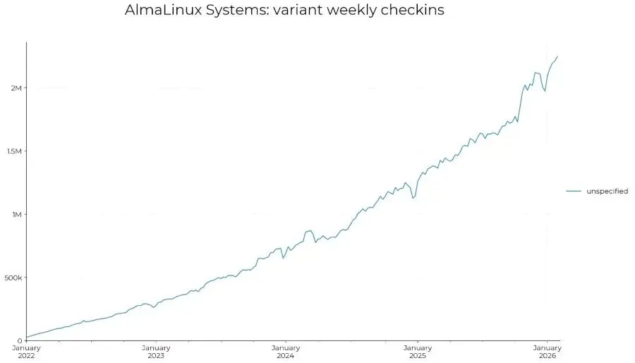 AlmaLinux每周的系统更新检查请求量已经突破了200万次大关。这个数字比起2025年刚开年的时候大概翻了一倍,说明在CentOS退场后,它的实际装机量依然在快速往上涨。