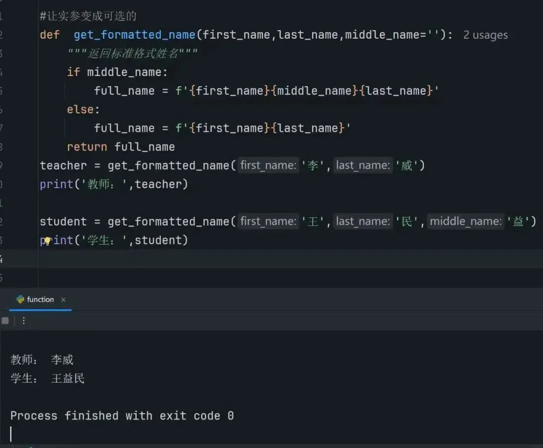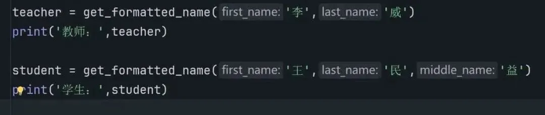 让实参变成可选的,主要是通过为函数的参数设置默认值来实现的。当调用函数时,如果没有为带有默认值的参数传入实际参数,那么该参数就会使用预先设定的默认值,如果传入了实际参数,则会使用传入的实际参数值。这样的好处是使函数更加灵活,能够适应不同的调用场景。在这个函数中first_name和last_name是必选参数,在调用函数时必须为其提供实际的参数值,middle_name是可选参数,因为它被赋予了默认值''(空字符串),这意味着在调用函数时可以选择是否为middle_name传递一个实际的参数。函数内部通过 if middle_name 语句来判断是否传入了middle_name的实参值,如果传入了(即middle_name不为空字符串)则将first_name、middle_name、list_name拼接起来形成完整的姓名,如果没有传入(即middle_name为空字符串)则只将first_name和list_name拼接起来形成完整的姓名。在teacher这个调用中没有为middle_name传递实际参数值,因此,middle_name使用其默认值''(空制符串),函数返回的结果是“李威”在student这个调用中为middle_name传递了实际参数值“益”,因此,函数会将三个名清洁起来,函数返回的结果是“王益民”通过在函数定义时为参数设置默认值,就可以让该参数成为可选参数。这样在调用函数时,根据实际需求决定是否传递该参数的值,从而增加了函数的灵活性和适用性。这种技术在处理具有多种可能输入函数的情况时非常有用,例如处理用户信息,配置选项等场景。