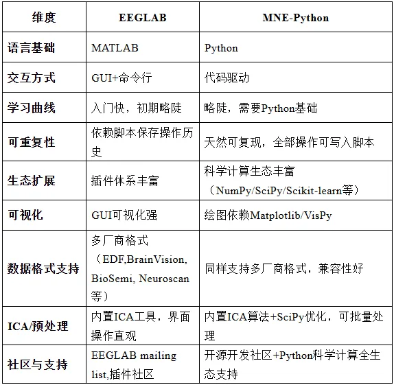 近年来,Python生态在神经科学数据分析领域快速发展。MNE-Python通过与各类科学计算库的结合,实现了高度可复现、易扩展的分析流程,这对于多被试群体分析、复杂实验设计以及自动化数据处理尤为重要。相比之下,EEGLAB在教学推广、ICA传统分析以及GUI友好性方面仍具有不可替代的地位,尤其适合快速原型探索和视觉化检查。两者各有所长,形成互补关系。