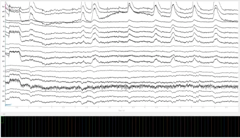 图四:含EEG 053坏导(灰色标记)的原始数据(上);使用MNE-Python对EEG 053坏导进行插值处理(插值后变黑色)(下)。