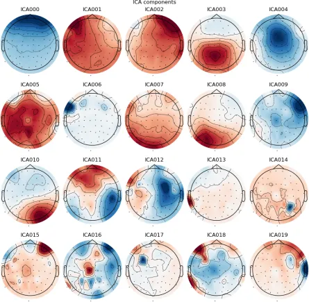 MNE-Python的ICA功能基于scikit-learn,强调流程化和可复现性。它支持自动检测EOG/ECG成分,并可以将训练好的ICA模型保存,用于批量处多个被试的数据。同时,用户仍然可以通过可视化接口(如ica.plot_components()、ica.plot_properties())手动查看每个独立成分的拓扑图、功率谱和时间波形,对可能的伪迹进行人工判断和标记。这使得MNE既适合大规模自动化处理,也支持探索性和手动审查,兼顾灵活性和可复现性。