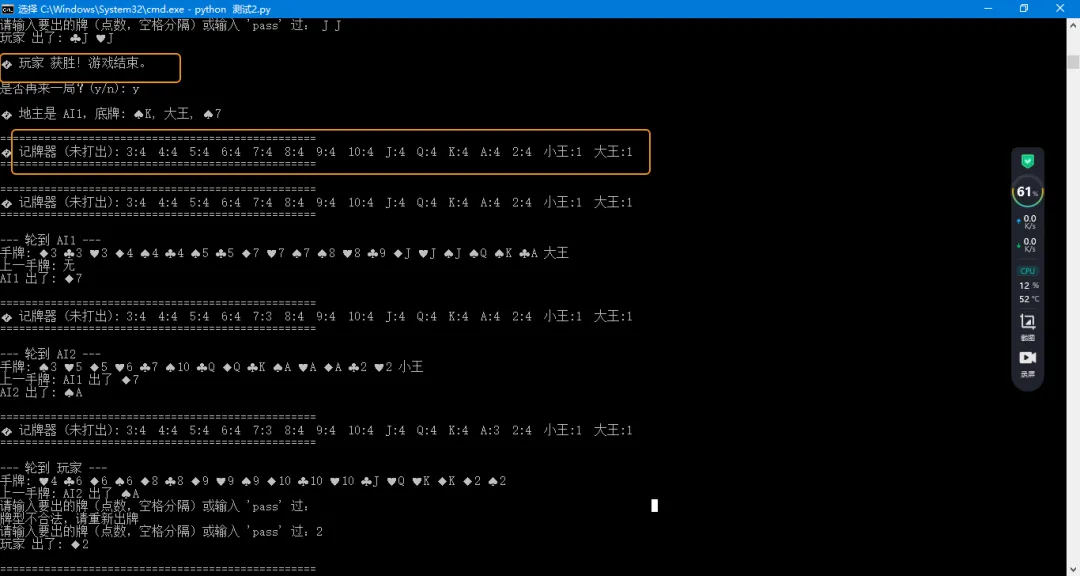 1.记牌器功能:发牌和地主拿底牌时不再扣除记牌器,只有在玩家实际出牌时才扣除。现在记牌器准确显示尚未打出的牌。添加了 ===== 分隔线和标题,使其在输出中更显眼。