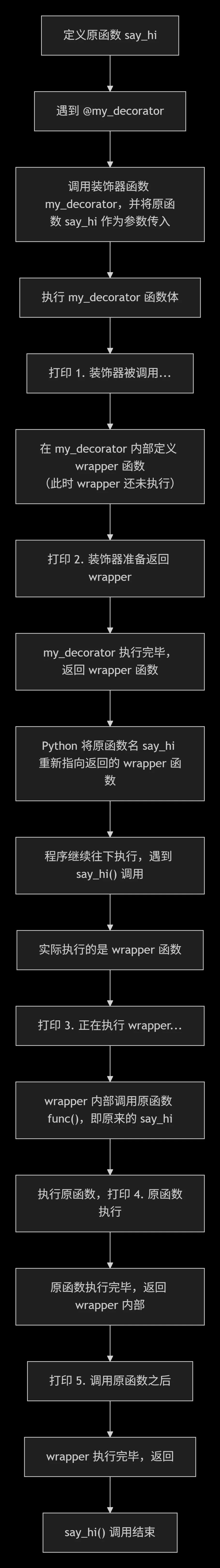 1. 装饰器 my_decorator 被调用了,它接收到的函数是: say_hi2. 装饰器准备返回 wrapper 函数--- 开始调用 say_hi() ---3. 正在执行 wrapper 函数,这是在调用原函数之前4. 原函数 say_hi 正在执行5. 这是调用原函数之后,wrapper 函数执行完毕--- 调用结束 ---
