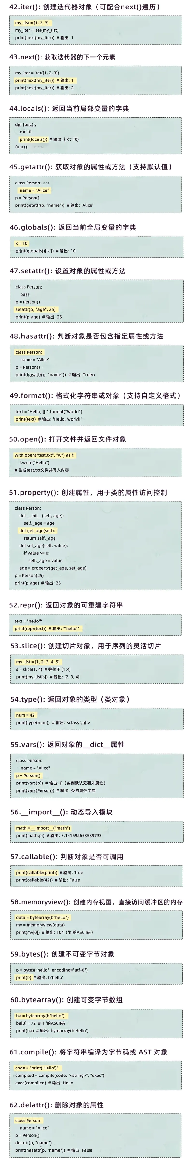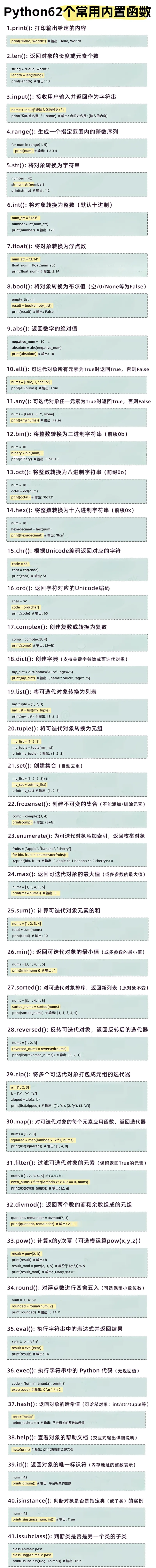💡Pythoner专业级干货,62个高频内置函数速查从基础 到高阶迭代,覆盖面试/项目/刷题全场景,每个函数附极简可运行示例,告别翻官方文档的低效,代码效率直接拉满!